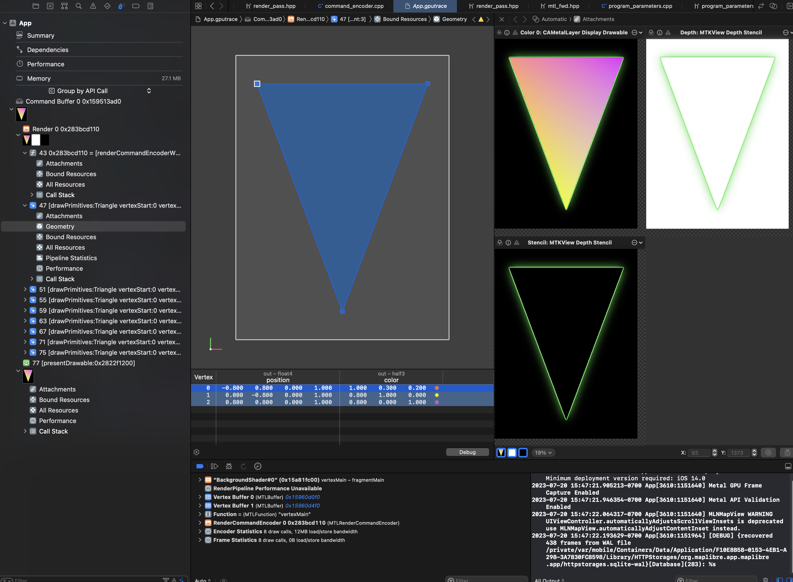 Work on the Metal rendering backend has started, and the first important steps have been completed. The first one being: drawing nothing with Metal. And the second one being: drawing a triangle with Metal!