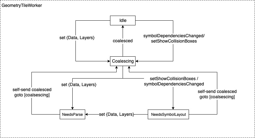 When a geometry tile worker has completed its work, it moves to Idle state by self-sending coalesced transition. Reiterating again, to consider the worker has coalesced, it has to parse all the coalesced data from available messages in the queue for a particular tile.